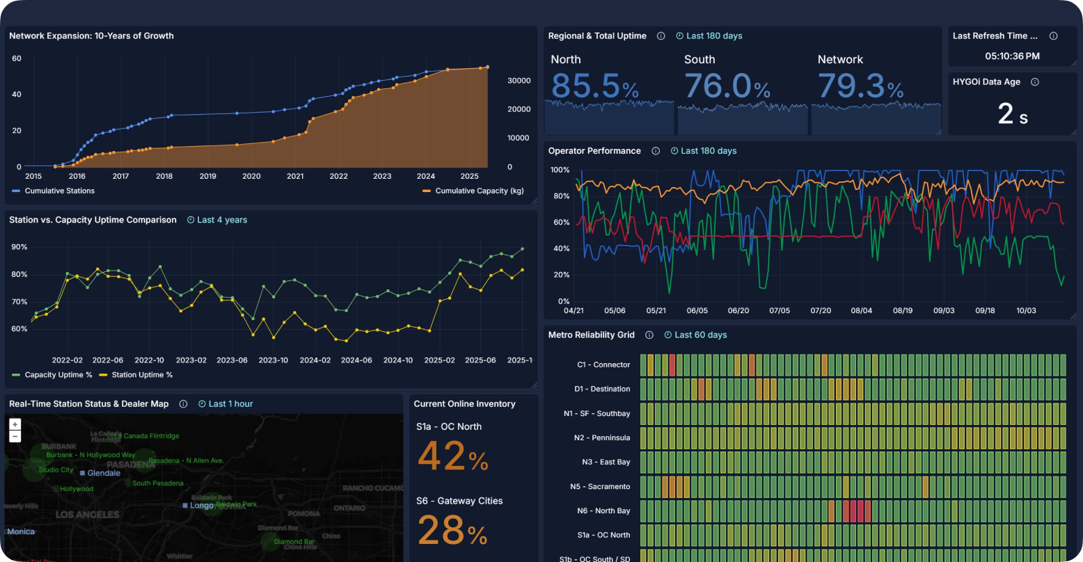 You're planning the future of hydrogen ecosystems. We've been tracking operations for a decade. HYGO-i measures equipment reliability, operator track records and regional demand patterns.